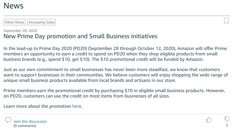 在这次的这个计划中,消费者可以在Primeday预热期(9月28日至10月12日)期间,购买"小企业支持计划"中的指定产品满10美金之后,亚马逊会直接返还10美金的抵扣券。这个抵扣券可以用在Primeday活动(13、14两天)中购买任意商品时抵扣。