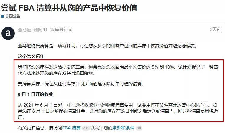 有卖家调侃,做亚马逊如同打怪升级,打完这个怪总有下个怪在路口等你。的确,近段时间跨境圈震荡不断,不少卖家面临着成本上涨、销量下跌、利润骤减等"怪物"的围困。而在卖家为了清理库存、刺激销量而身陷价格战泥沼之际,亚马逊于近日推出了FBA批量清算计划。亚马逊推出FBA物流清算计划AMZ123获悉,近日亚马逊推出一项FBA物流清算计划,帮助卖家处理冗余库存以及被买家退回的商品,收回商品的部分成本,避免产生