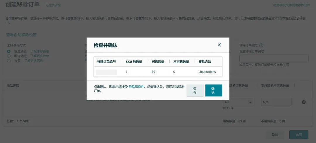 在"创建移除订单"页面中的"选择移除方式"模块下,选择"批量清货",并填写要清货的商品数量(【可售数量】或【不可售数量】),然后点击"查看",进入到订单检查页面。
