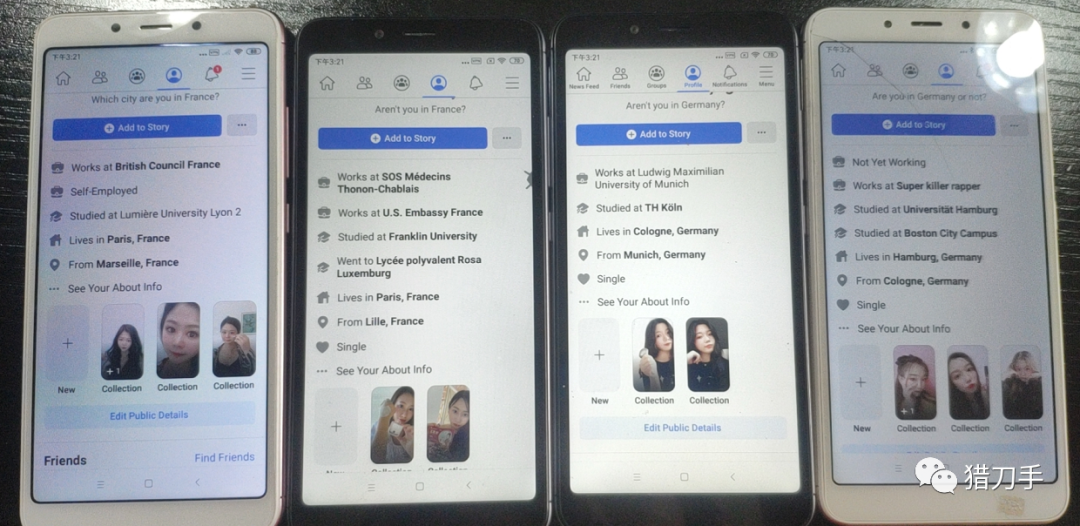 比如现在我们看到的这批账号,那么前面两台手机主要是加法国地区的人,后面两台手机主要是加德国地区的人。但是你要知道,像法国德国这种比较大的国家,那么他们的这种地区出现的样式可能都有好几百种。所以作为软件来说,他没有办法去100%的匹配啊,几个中国地区的例子,你就会才能够明白了。