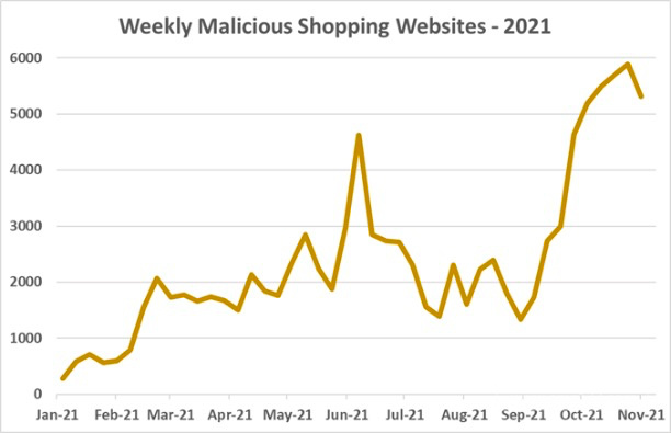 CPR研究显示,自2021年10月初以来,与购物和销售优惠相关的钓鱼网站数量最多。平均而言,每周新增超过5300个不同的钓鱼网站,与2021年迄今为止的平均水平相比增加了178%。