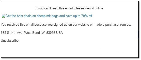 这些不法分子首先通过向消费者发送和品牌或者平台相似钓鱼邮件,例如模拟MichaelKors发送的电子邮件,如下图所示:
