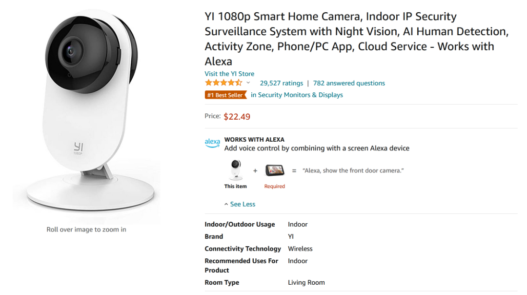 根据笔者查询过往资料以及 Amazon 销售情况,小蚁科技在海外的爆款产品是一台定价在 29.99 美元(笔者发稿前查看降为 22.49 美元)的家用智能摄像机,要想操作摄像机,就需要使用到「YI Home」这款 App,通过 App,用户也可以将 Amazon 的智能音箱 Alexa 与摄像头绑定。小蚁品牌旗下的其他智能摄像机也是如此。