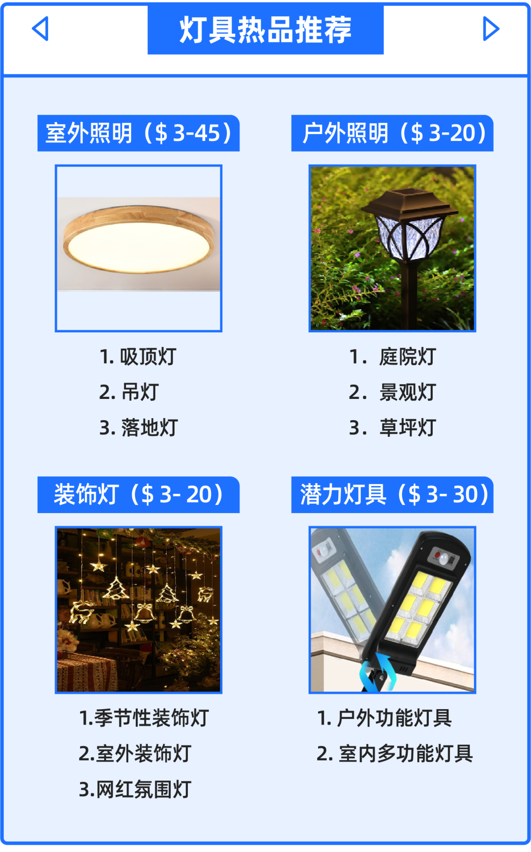 根据东南亚当地气候,户外照明需求点明显。因常年多雨,防水、防雷、有太阳能的户外照明设备更受青睐。东南亚多个国家都是旅游大国,户外照明类目也有相当一部分订单来自民宿、景点商家的装修需求。
