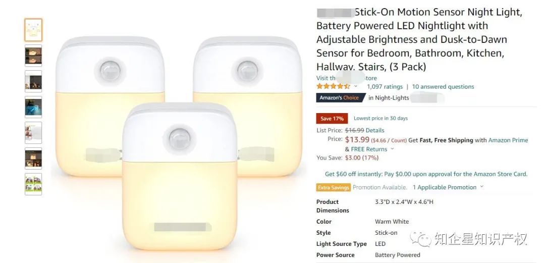 今天在浏览亚马逊的时候,看到一款感应灯,它是美亚站的是Amazon's Choicein Night-lights,售价13.99美金,留评1097颗星。