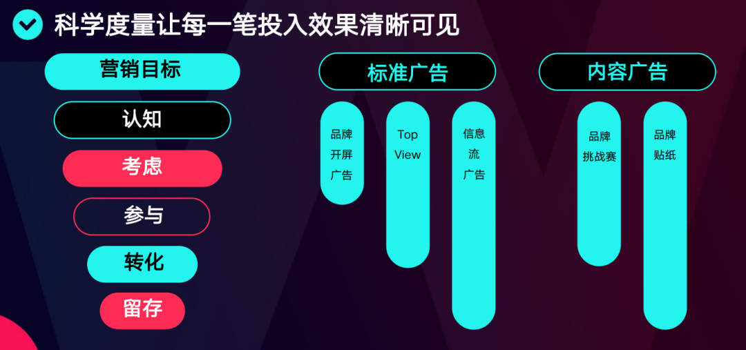卧兔网络是TikTok For Business的官方代理,在投入的过程中,我们力求科学度量让每一笔投入的效果都能清晰可见。这里给大家介绍投流的6个考虑层面:营销目标、认知、考虑、参与、转化、留存,6个层面成漏斗式模型。