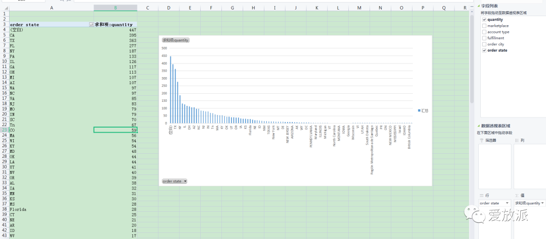 下载报告,selling fees筛选为小于0,筛选要了解的sku,选order state和quantity做透视表。就能知道这个产品主要市场在哪个州。由这个图我们可以得知88.5%的订单由32个州贡献。