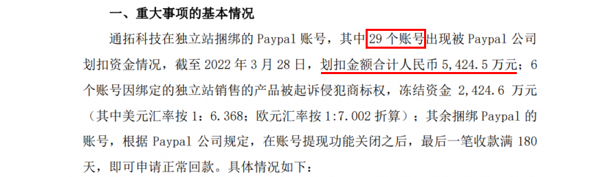 29个账号出现被Paypal公司划扣资金情况,截至2022年3月28日,划扣金额合计人民币5424.5万元;