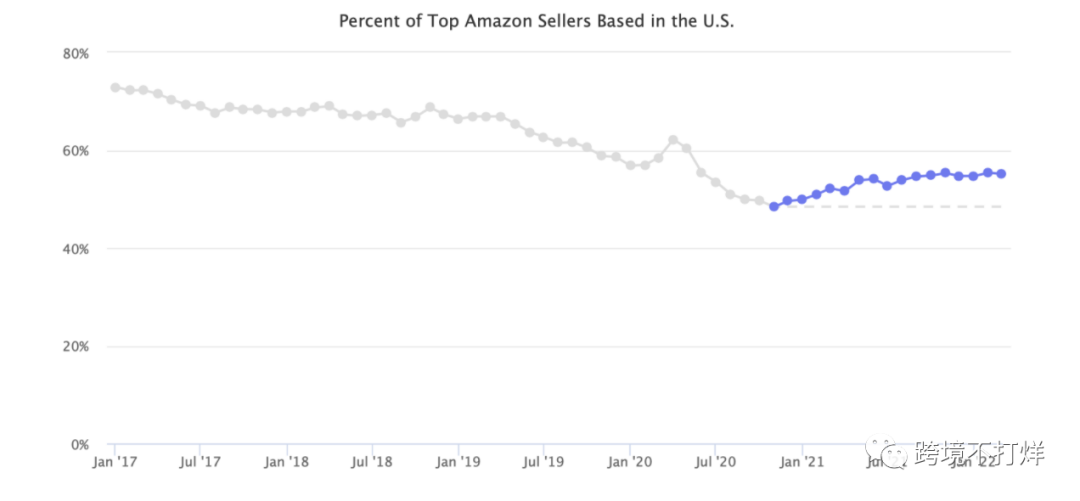 亚马逊美国市场上 55% 的顶级第三方卖家是国内企业,较 2020 年 11 月 48% 的历史低点有了显著增长。在过去的 16 个月中,美国卖家的份额一直在增加. 多年来,该百分比一直在稳步下降。