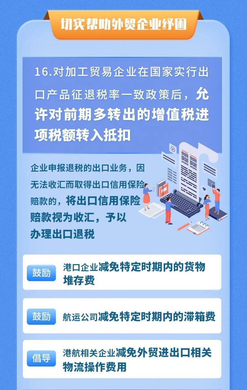 在退税和补贴方面,进一步加大增值税留抵退税政策力度,在更多行业实施增值税存量和增量全额留抵退税,对餐饮、零售、旅游、交通运输、文体娱乐、住宿、会展等困难行业企业给予一次性稳岗补贴,对符合条件的用人单位给予一次性吸纳就业补贴。