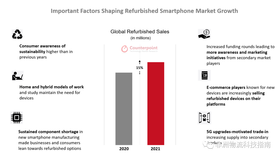 从Counterpoint Research全球翻新智能手机追踪报告显示,2021年全球二手或翻新智能手机市场同比增长15%,同期新机的增长率只有4%。可见现在增量市场上翻新机是一个能够发力的好品。