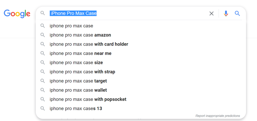 比如说,把" iPhone Pro Max Case"放到谷歌搜索框,谷歌会出来一些相关的关键词: