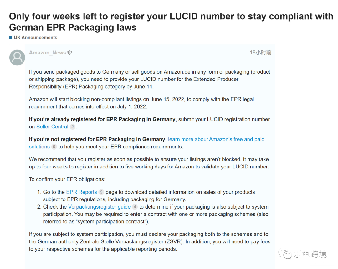 2022年7月1日德国EPR包装法即将生效,很多平台都加紧了要求卖家的步伐,亚马逊、速卖通、eBay、Wish等平台都曾发布公告表示,卖家通过平台向德国售卖产品,平台需要确认卖家商品是否符合德国EPR制度的要求。