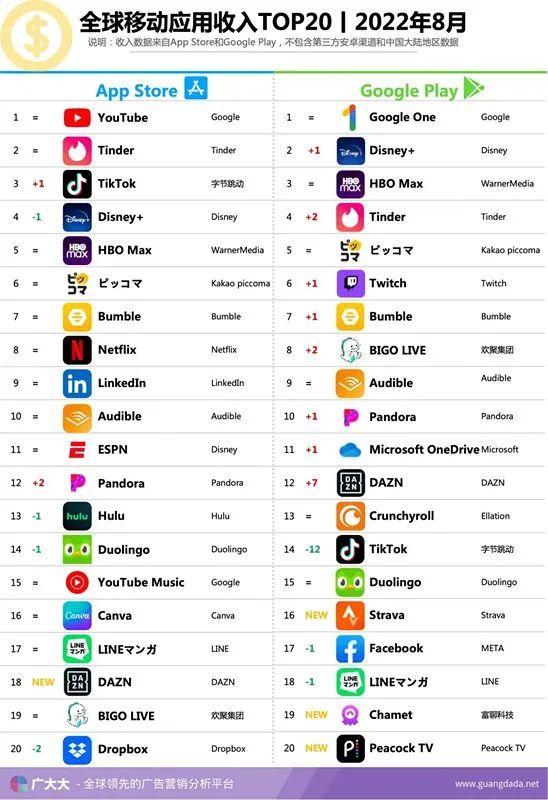 根据广大大 App Intelligence 等模块数据,笔者整理出 2022 年 8 月全球移动应用(非游戏)收入、下载、投放 TOP20 榜单,帮助更多移动应用从业人员了解全球移动市场变化趋势。