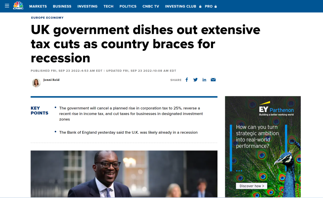 AMZ123获悉,据外媒报道,9月23日,英国政府宣布了自1972年以来最大规模的一次减税方案,其措施涉及个人所得税、财产税、海外游客购物消费税和企业税,预计到2026-2027年,减税总额将达到450亿英镑。