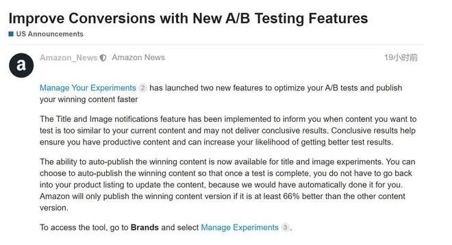 不知道亚马逊卖家朋友有没有玩亚马逊的亚马逊 A/B 测试功能,这个功能非常不错能提供链接的转化率。前几天亚马逊美国站发布公告称"理您的实验"推出了两项新功能来优化A/B测试并提高产品的曝光度,目前标题和图像通知功能已上线。
