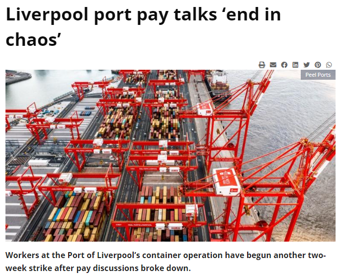 根据海事新闻报道:利物浦港的所有者 Peel Ports 声称 Unite 工会拒绝了11%的薪酬提议,在工资讨论破裂后,利物浦港集装箱业务的工人将在10月24日至11月7日进行为期两周的罢工。