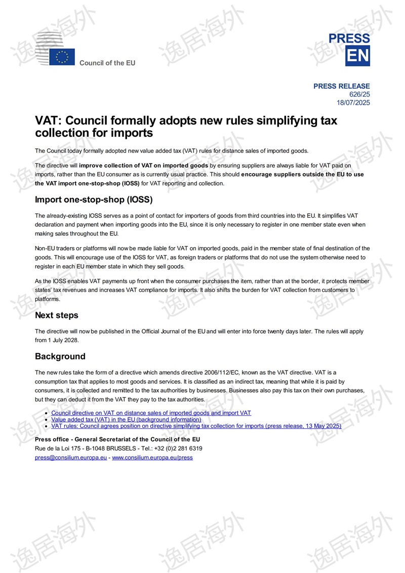 欧盟理事会于2025年7月18日正式通过了修订版欧盟《VAT指令》(Directive 2006/112/EC),旨在改革跨境进口销售的增值税征收机制,特别是针对非欧盟商家对欧盟消费者的商品销售。