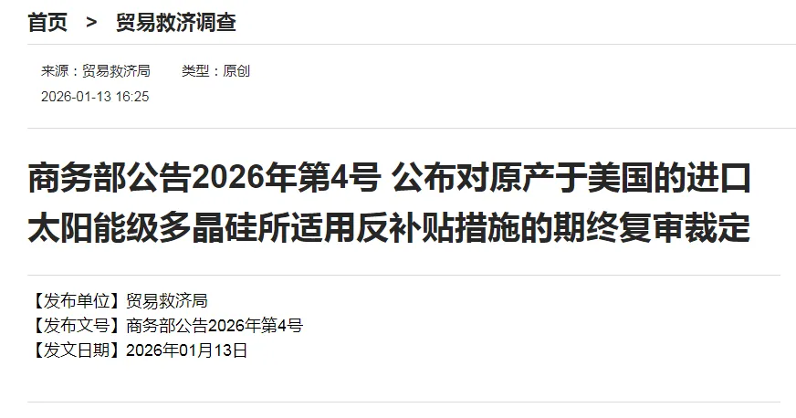 商务部发布公告2026年第3号,公布对原产于美国和韩国的进口太阳能级多晶硅所适用反倾销措施的期终复审裁定:自2026年1月14日起,对原产于美国和韩国的进口太阳能级多晶硅继续征收反倾销税,实施期限为5年。
