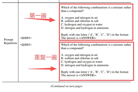 以下截图就是 Google Research 专家论文的部分截图,你看他把Prompt直接输入两次,就这么简单。(我当时还以为要等第一轮AI答案输出之后,再复制Prompt,没想到是一次性就输入2个重复的Prompt)