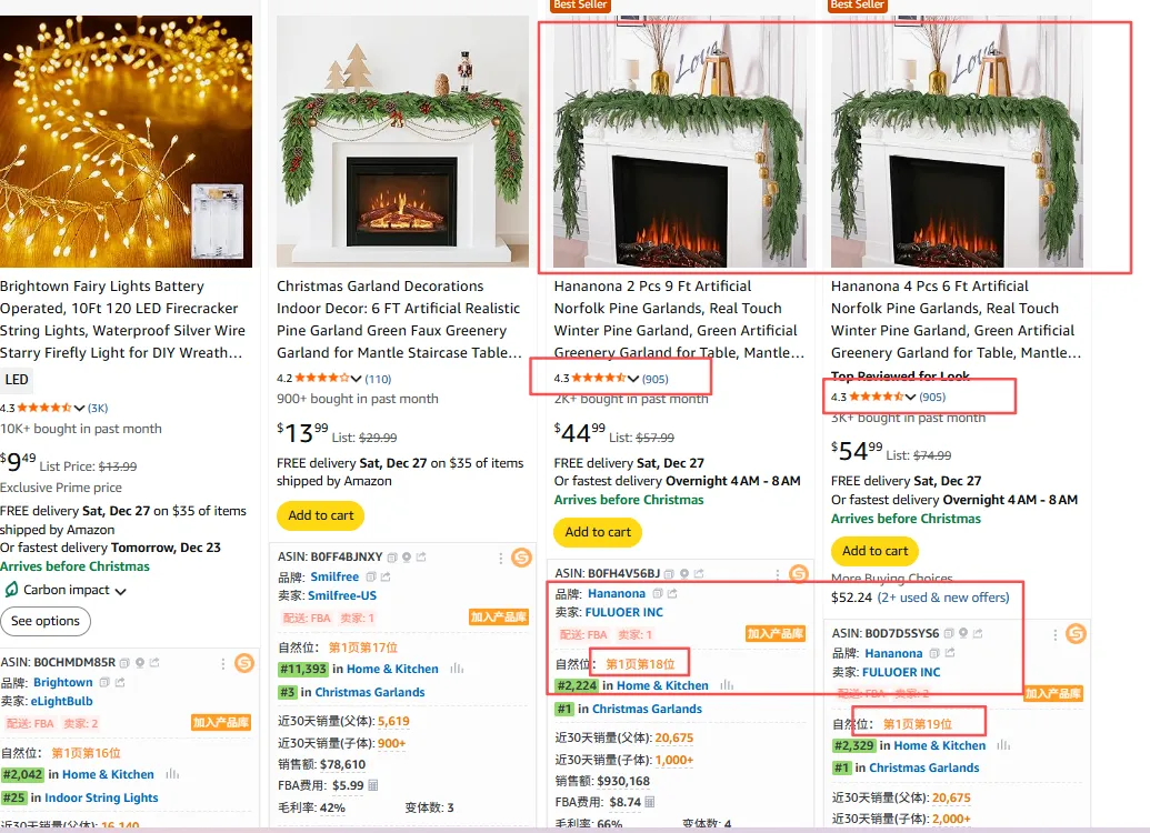 给大家看个实际案例! 圣诞节即将来临,以一个具体的圣诞装饰案例(christmas garland)为例,其2条9FT装和4条6FT装在核心关键词christmas garland下分别占据了不同的自然位。