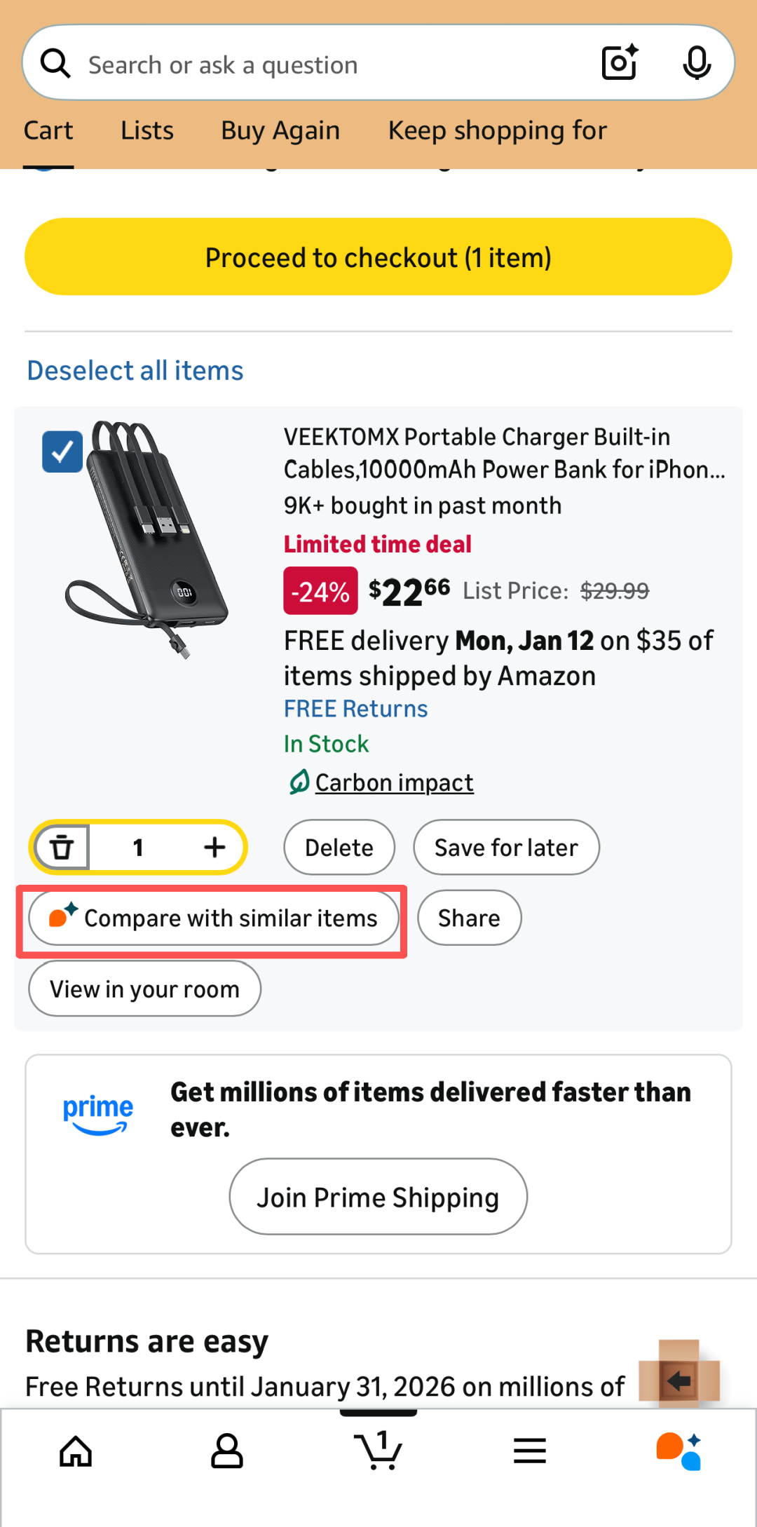如果卖家最近细看过亚马逊的页面变化,就会发现一个非常值得警惕的变化:Rufus,已经不只在搜索框里"帮买家找东西",它开始在购物车里,直接"帮买家做决定"。图片来源:亚马逊在手机端的在购物车页面,一块
