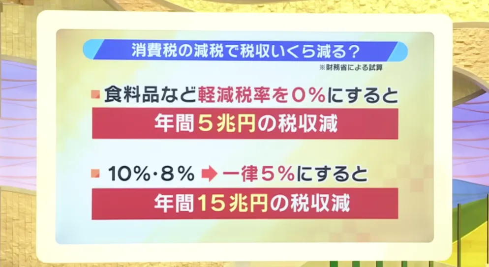 日本财务省估计:如果食品税率为零,税收收入每年将减少约 5 万亿日元;如果消费税的所有税率都降至 5%,税收收入将减少约 15 万亿日元。
