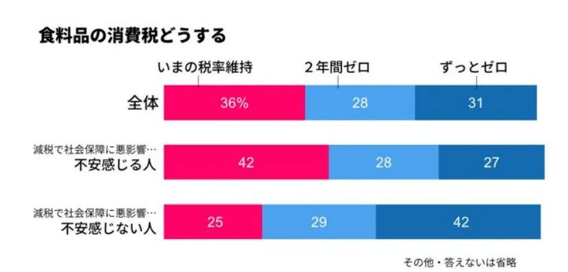 日本《朝日新闻》于2月14日至15日进行了一项全国电话民意调查,询问受访者对食品消费税的看法。调查结果显示,受访者的意见分为三类:"维持现有税率"(36%)、"两年内零税率"(28%)和"永久零税率"(31%)。与此同时,大多数受访者(71%)担心降低消费税会对社会保障产生负面影响。